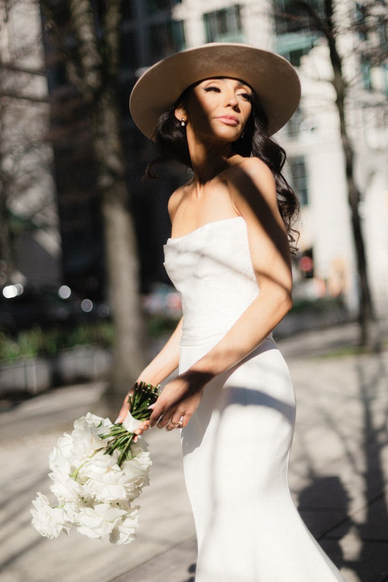 We took to the rooftop at the Fairmont Vancouver for their first look, enjoyed the stately atmosphere of the stone steps and columns indoors, and enjoyed some rare sunlight in February. As the light popped and peeked through the windows at the Settlement Building, we witnessed the most beautiful and touching entrance by Alaina and her father. We looked on in awe at the incredible floral installation by the madly talented Carl Ostberg and Hanaki Floral, as we absorbed every bit of love emanating from the two beautiful humans standing in front of it. We threw petals, wiped away tears, and enjoyed togetherness in this historic space.